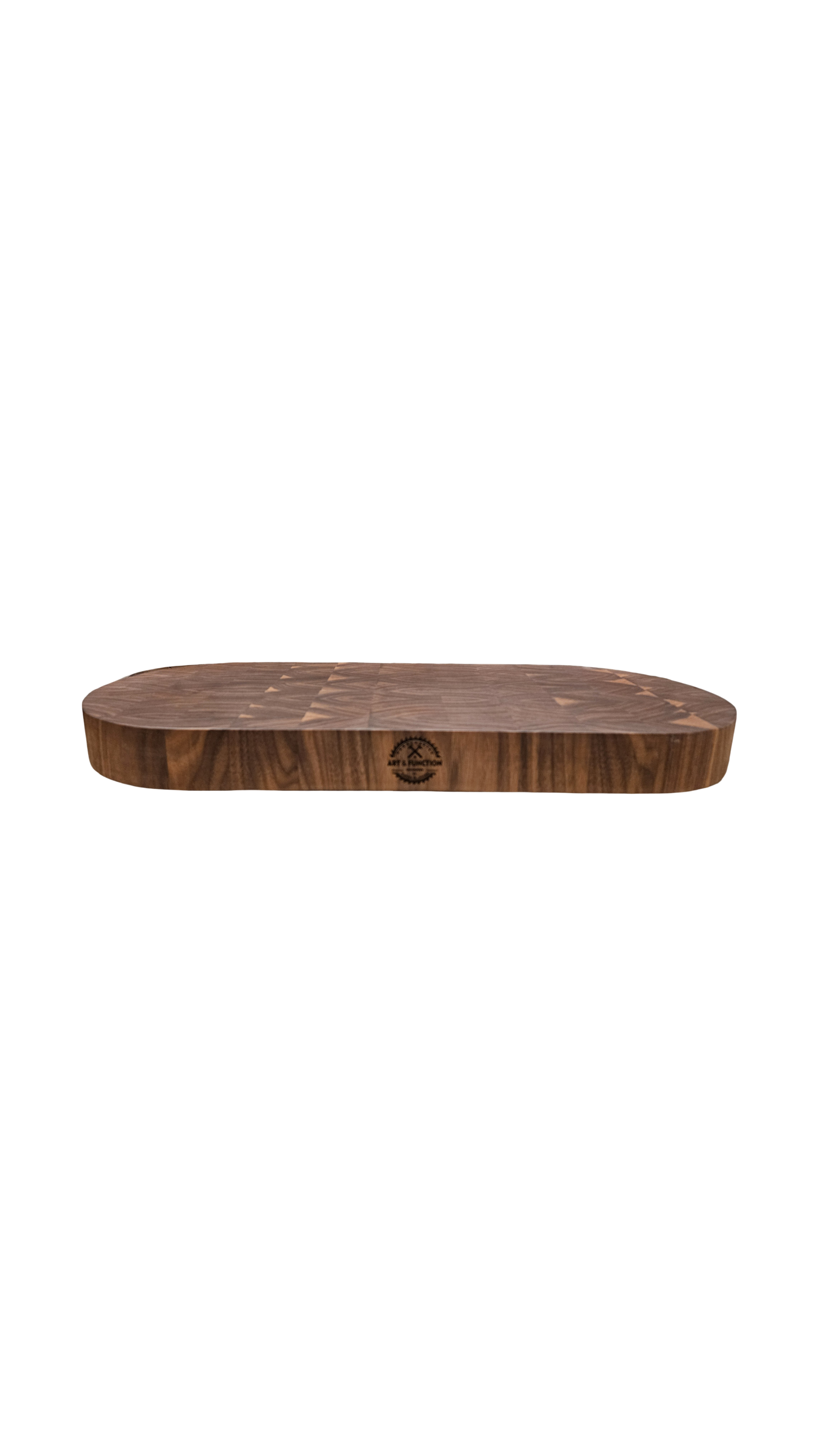 This Capsule Shaped Walnut Butcher Block is expertly crafted from end-grain walnut, providing a durable and long-lasting surface for all your cutting and chopping needs. The rubber feet and easy pick up grooves ensure stability and convenience while preparing your meals. Measuring at 23" x 9.5" x 2", it is the perfect size for any kitchen.