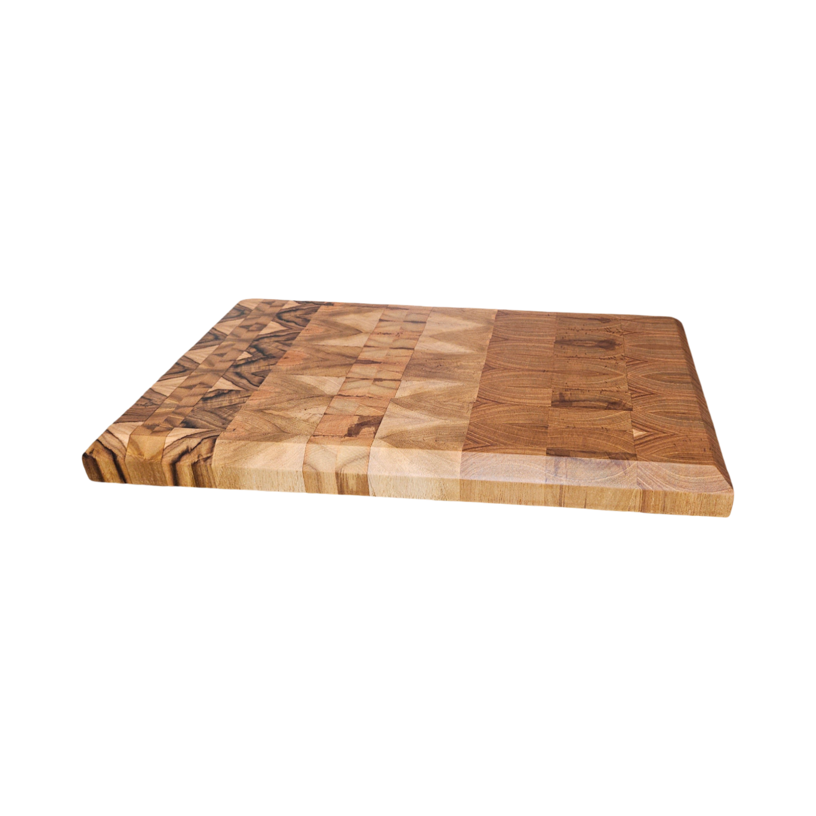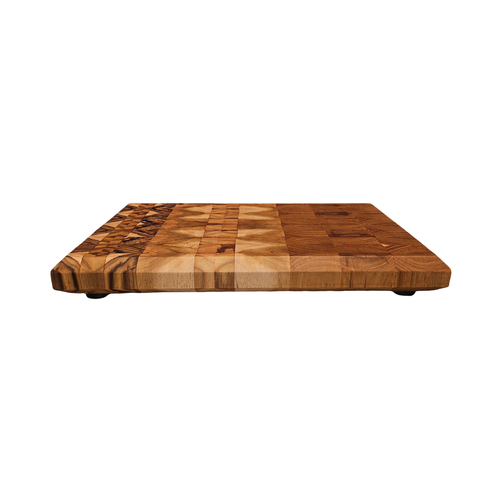 Crafted from high-quality teak, this 15"x 9."x 1.75" butcher block is designed with end grain construction for durability. The easy pickup grooves and rubber feet make prep work a breeze while preserving your countertops. With its sturdy build, this block is perfect for any kitchen or professional setting.