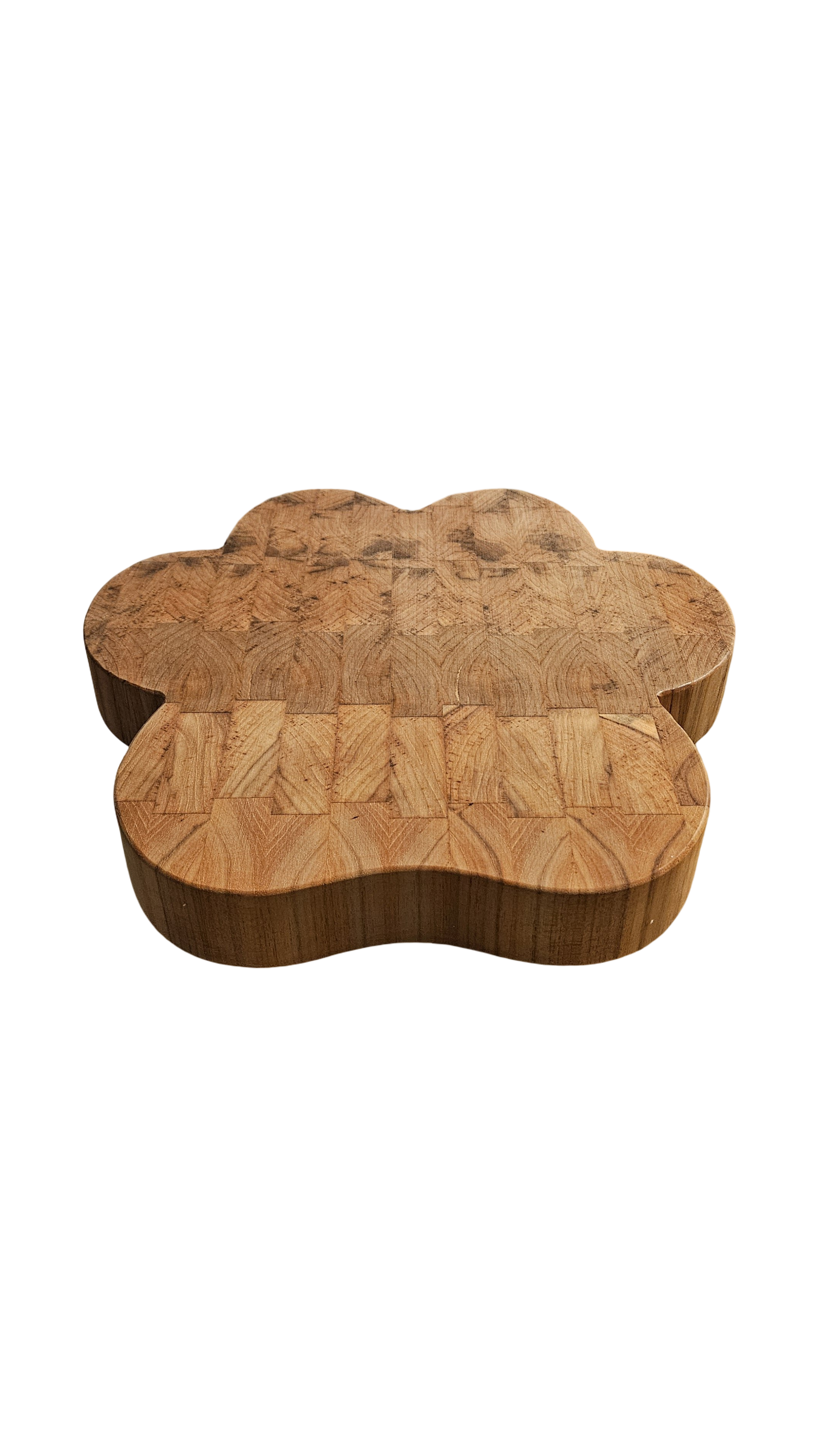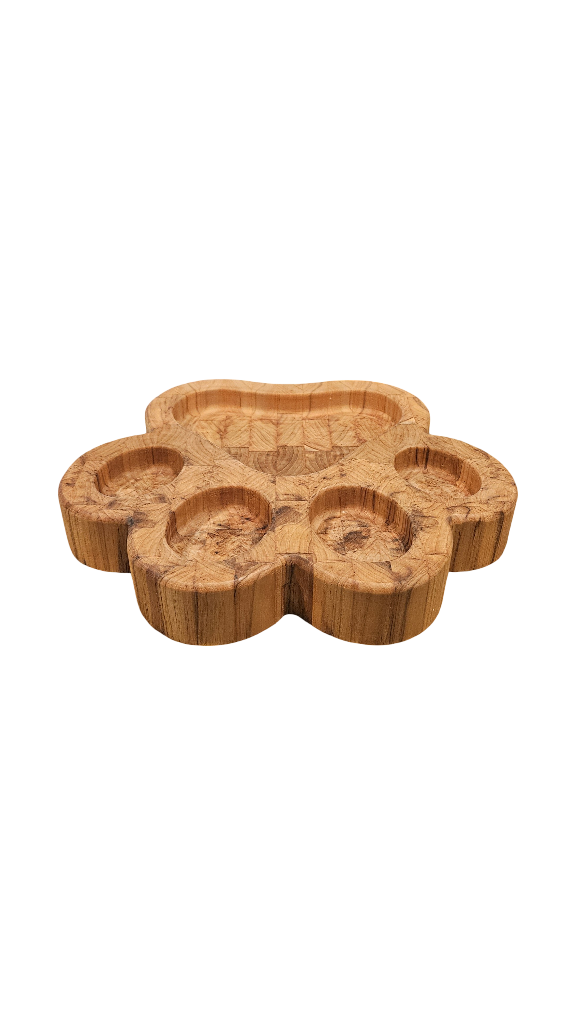 Crafted from sturdy end grain teak, the "PAWfect" charcuterie board measures 14.5 x 13.5 x 2 inches. ( Each bowls is 1" depth) Use this reversible cutting board to beautifully display and serve cheese, meats, and more. Its durable design will elevate any dining experience.