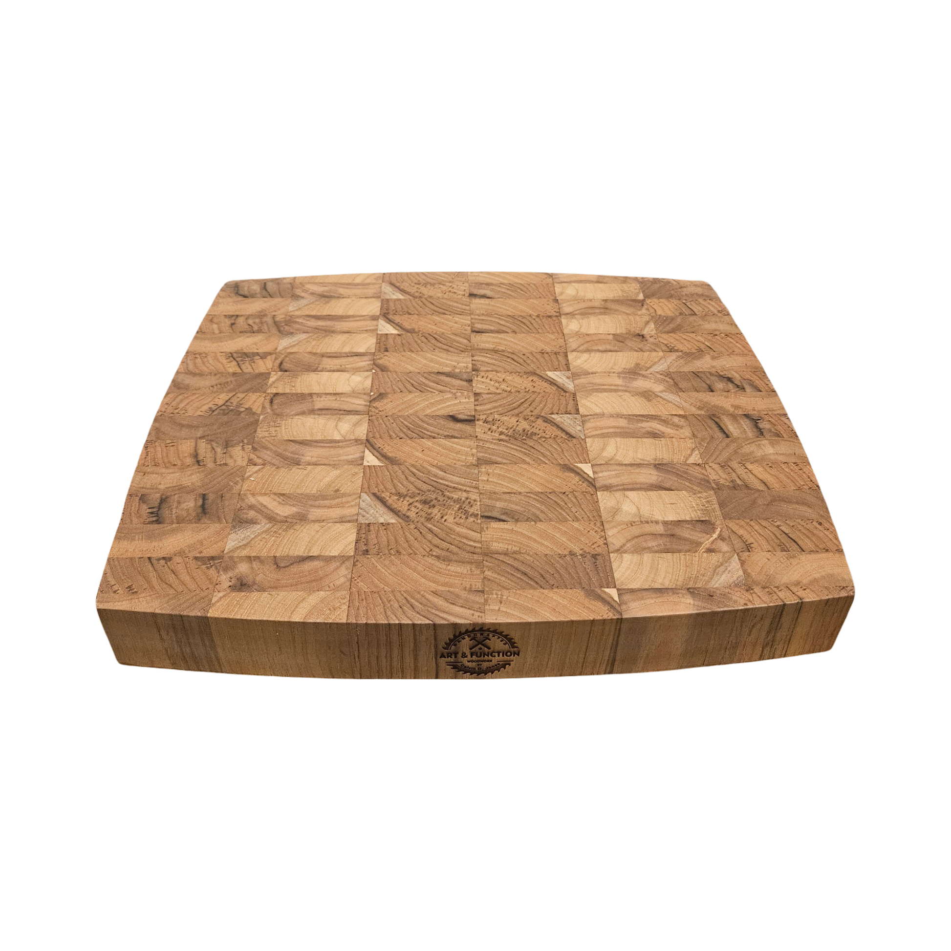 Expertly crafted from durable teak wood, this Tonneau shaped Butcher Block measures approximately 16 x 14 x 2 and features rubber feet and easy access grooves for convenient pickup. Enhance your cooking experience with this versatile and easy-to-clean kitchen essential.