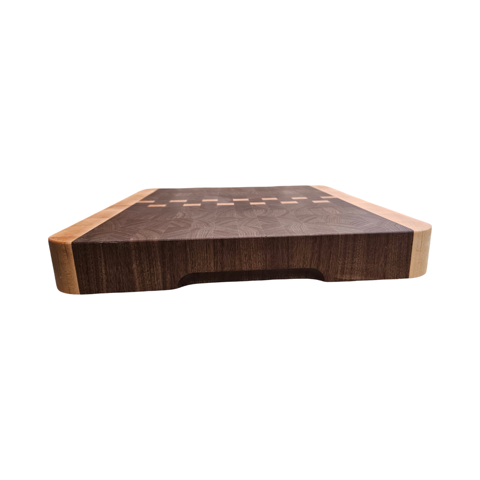 Expertly crafted, this Walnut and Maple Butcher Block measures 13.5 x 17.5 x 1.75 and features easy pickup grooves and rubber feet. Handmade with high-quality wood, it provides a sturdy and durable surface for all your chopping and cutting needs. Ideal for home cooks and professional chefs alike.