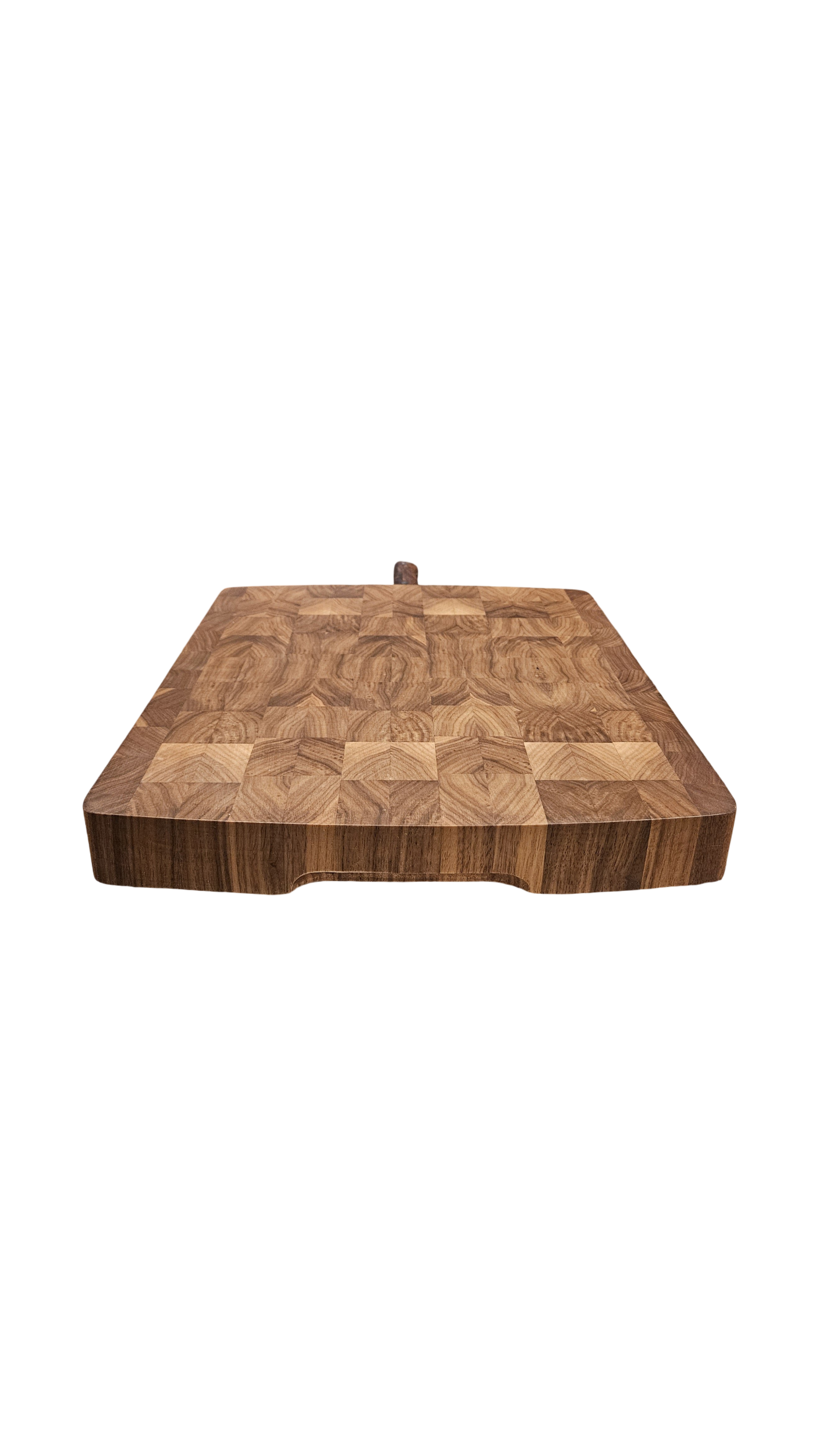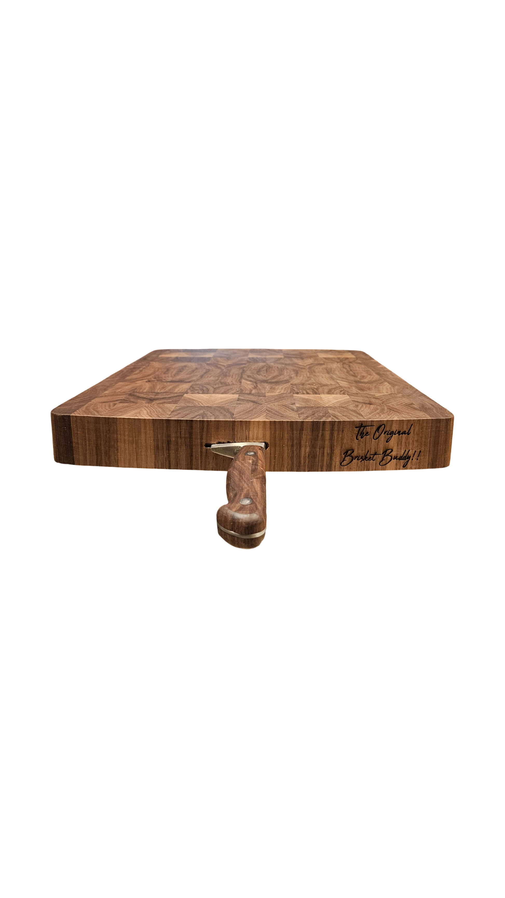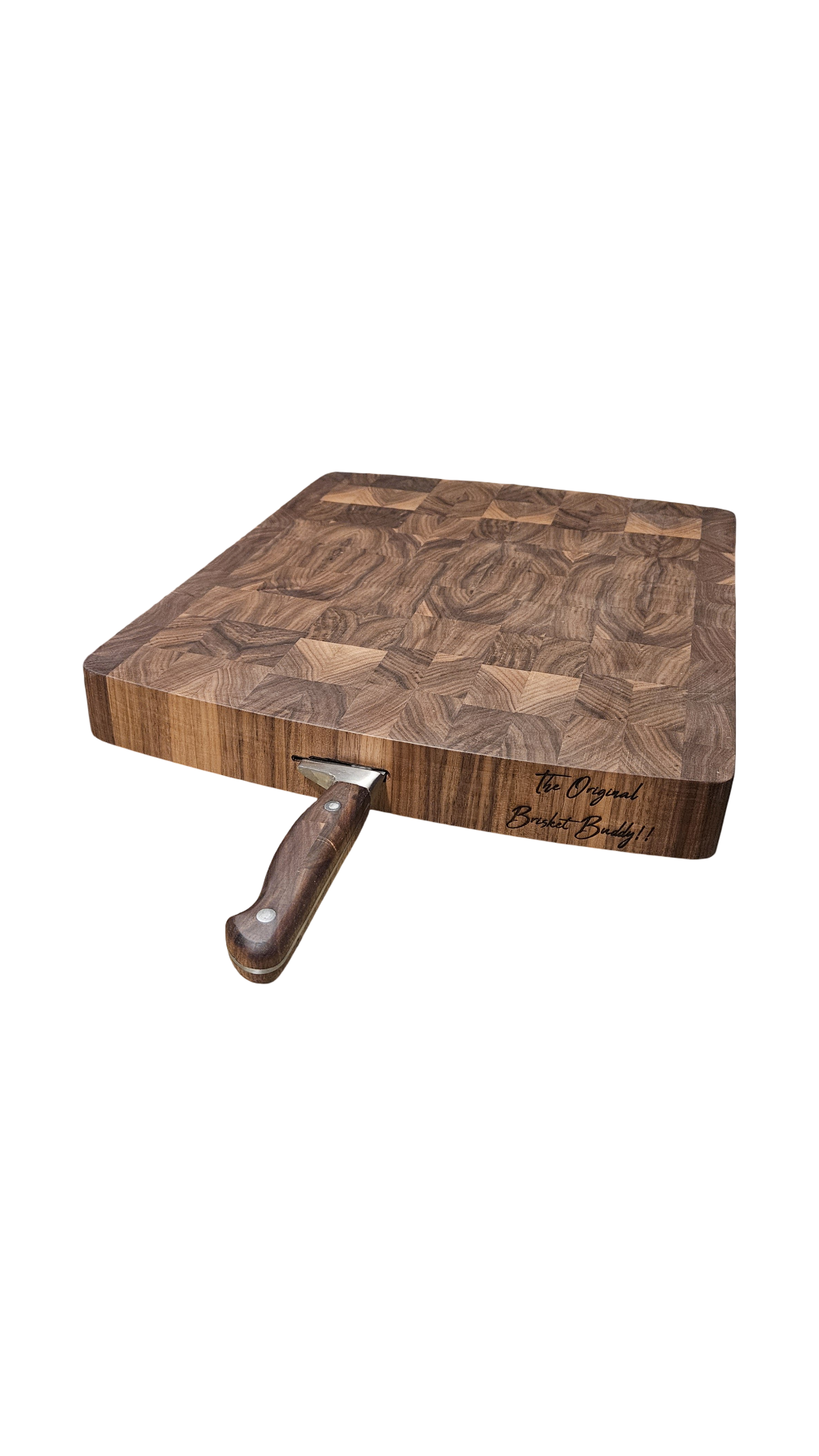 The 18' x 14.5" x 2▪︎" Walnut Brisket Buddy is expertly crafted with end grain walnut and a German steel 8in chef knife. The magnetic insertion ensures a secure fit, while the handmade walnut handle adds a touch of elegance. Enjoy precise slicing and effortless handling with this professional-grade One of a kind "Original Brisket Buddy!!"